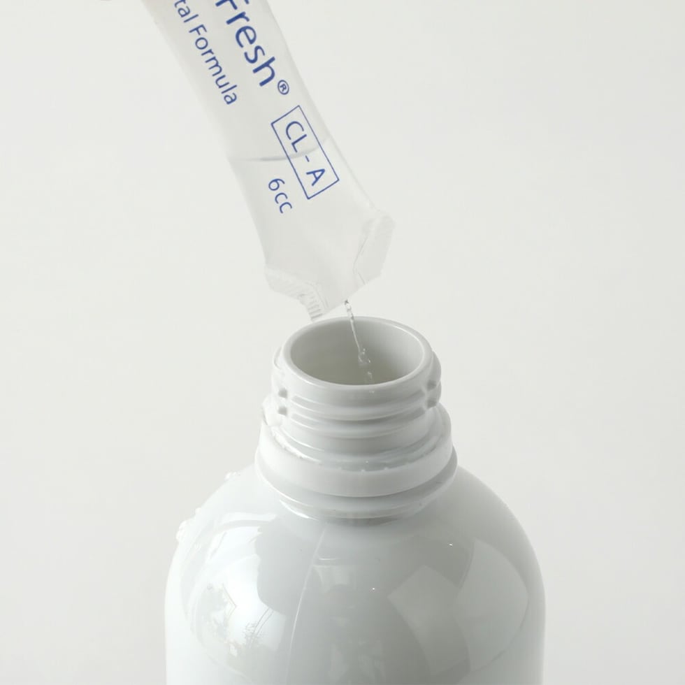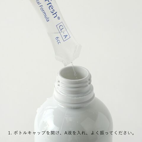 1. ボトルキャップを開け、A液を入れ、よく振ってください。