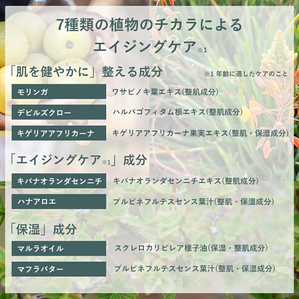 生命力あふれる大地から。 乾燥による肌トラブルを防ぎ、肌を健やかに保つ天然由来成分100%の保湿クリームです。アフリカに育つ7種の植物オイル・エキスが肌にやさしく寄り添い、うるおいを与えながら、季節や環境の変化による肌のゆらぎにアプローチ。しっとりなめらかな素肌へ導きます。