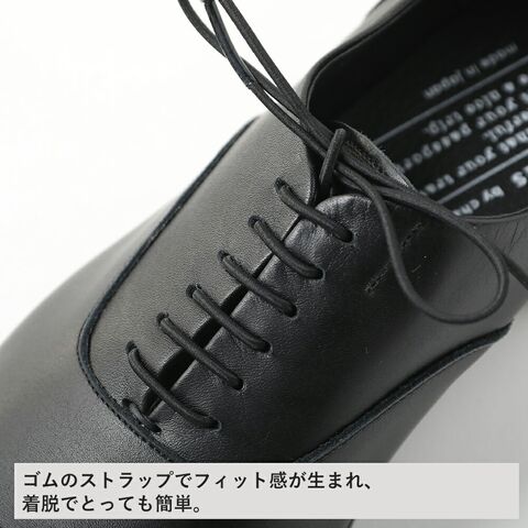 履くだけで背筋が伸びるような、洗練されたマニッシュシューズ。完全防水ではありませんが防水加工を施しているから出先の急な雨も安心ですね。![]() 1段目/左:ゴムのストラップでフィット感が生まれ、着脱もとっても簡単。 1段目/右:ストレートチップが洗練されたのアクセントに。 2段目/左:インソールには低反発特殊ウレタンを使用し、歩行の際の衝撃を吸収し疲れにくい構造に。ソールには、英文で「良い旅を!」のメッセージが刻まれています。 2段目/右:ソールの高さは2.5センチ。 | ||||||||||||||