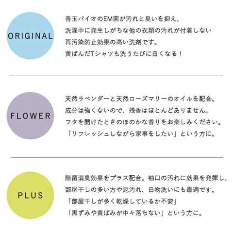 | 善玉バイオのEM菌が汚れと臭いを抑え、洗濯中に発生しがちな他の衣類の汚れが付着しない再汚染防止効果の高い洗剤です。黄ばんだTシャツも洗うたびに白くなります。「衣類の洗剤残りや洗濯槽の洗濯カスが気になる」という方におすすめです。 | |