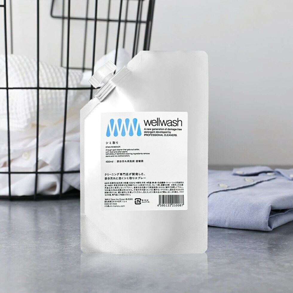wellwash 海をまもる洗剤 シミ取りスプレー 詰替えパウチ 400ml | 海をまもる洗剤 海を守る洗剤 食べこぼし 黄ばみ シミ クリーニング スプレー ノンシリコン 黒ずみ 襟袖汚れ 詰替え パウチ 2回分