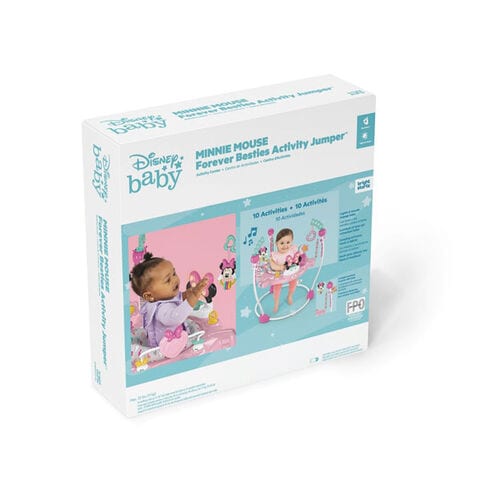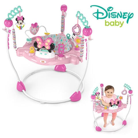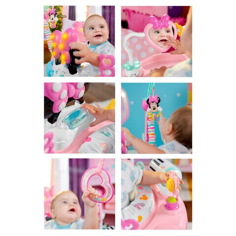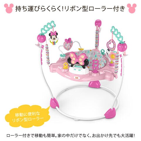 お子様の成長に合わせて高さを調整できるジャンパー。シートは360度回転するので全てのおもちゃに手が届き、好奇心を育みます。楽しいメロディや効果音が流れ、赤ちゃんが飽きずに遊べます。リボン型のローラー付きで移動も簡単。ご家庭でもお出かけ先でも、ミニーちゃんと素敵な時間をお過ごしいただけます。