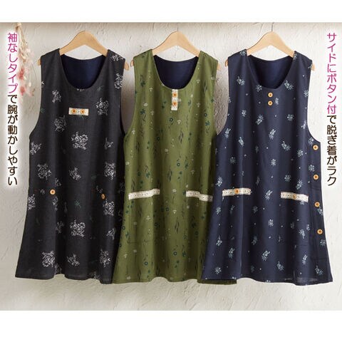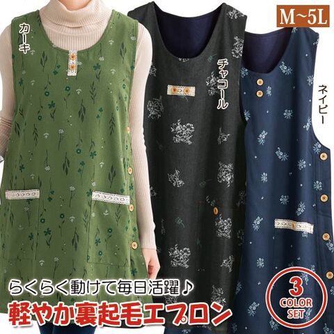 袖なしで動きやすいのに裏起毛であったか!毎日活躍する北欧風ナチュラルエプロン3枚組です。表側はしなやかな綿混素材、裏側ふんわり起毛素材で寒い季節も快適。袖なしタイプで腕が動かしやすく、セーターの上にもスッキリ着られます。サイドにボタン付きで脱ぎ着もらくらく。便利なポケット付きです。ほっこり北欧風の柄がかわいい3色組でのお届けです。
