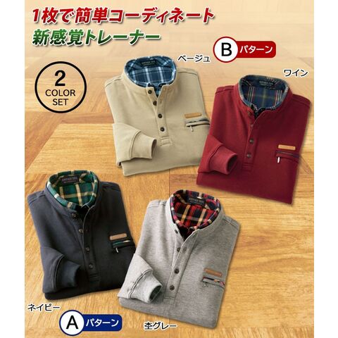 柔らかくソフトな肌ざわりの素材を使用したトレーナー。重ね着風に見える2重衿仕様なので、コーディネートに悩む必要もなくお洒落感を演出できます。左胸に物を入れても落ちにくい安心のファスナーポケット付き。カラーはAパターン(ネイビー+杢グレー)とBパターン(ベージュ+ワイン)の2セットからお選びいただけます。