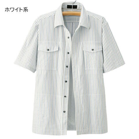 爽やかなストライプ柄の半袖シャツジャケット。外4カ所・内6カ所の10ポケットを搭載。スマートフォンや財布・メガネ等ちょっとしたポーチ並みの収納力で、手ぶらで外出もOK。ホワイト系・ネイビー系の2色セットでお届けします。
