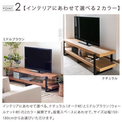 直線的でシンプルなシルエットが特徴のローボードアレッシア。天板に厚みをもたせる事で天然木のあたたかみが感じられ、ナチュラルな風合い。仕切りのないデザインだからボックスやかごなどを使って自分の使いやすいようにアレンジが可能です。カラーははっきりとした美しい木目が特徴のナチュラル(オーク材)としなやかで暖かみのある木目が楽しめるミドルブラウン(ウォールナット材)の2色展開です。オイル仕上げで使い込むほどに味わいが増します。設置スペースにあわせて、幅150・180cmの2サイズからお選びいただけます。