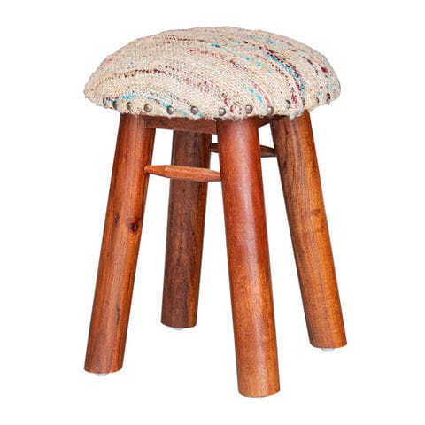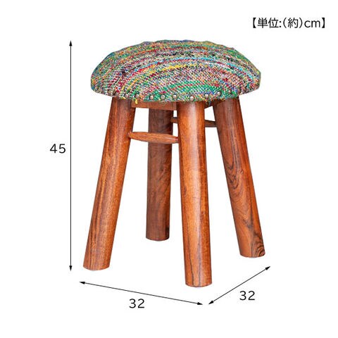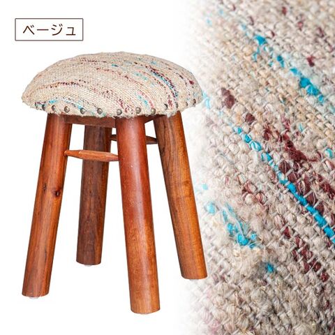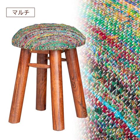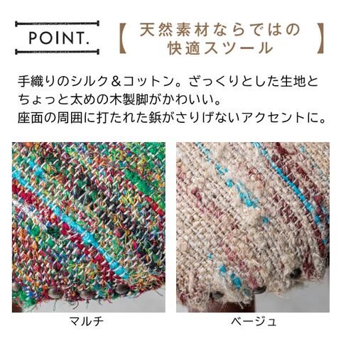 マンゴー材を使用した風合いのある太めの木脚と、カラフルな色合いのファブリックを組み合わせたアジアンテイストのスツールです。座面は肌ざわりの良い手織りのシルク&コットンの生地を使用。汗ばむ季節はベタつかず、冬場はヒヤッとしないので、オールシーズン快適にご使用いただけます。座面の周囲に打たれた鋲がさりげないアクセントに。脚の裏面には床の傷防止のパーツが付いています。背もたれがないから持ち運びも簡単!座面のカラーはマルチとベージュの2色からお選びいただけます。