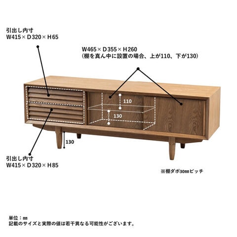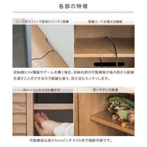 | 仕様 | 扉仕様/引き戸、レール/3段スライドレール、背板/化粧仕上げ、コード穴/2カ所、引出仕様/四方組 脚を取り付けるだけの簡単組立仕様 |