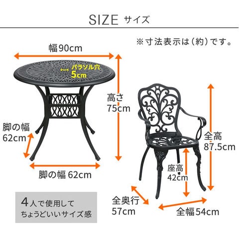 | サイズ(約) | ラウンドテーブル/幅900×奥行900×高さ750mm アームチェア/幅540×奥行570×高さ875mm・座高420mm |