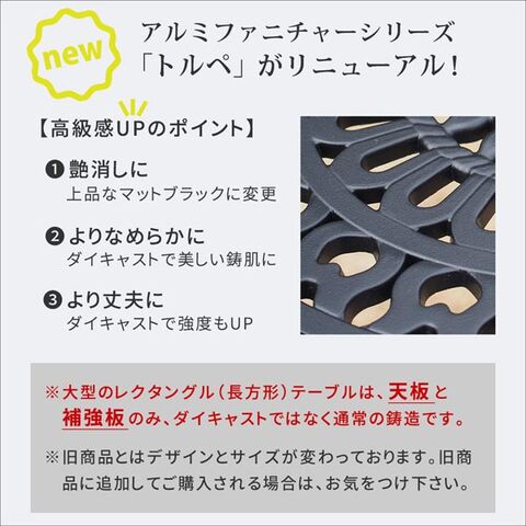 アルミファニチャーシリーズ「トルペ」がリニューアル。カラーを上品なマットブラックに変更。また鋳造→ダイキャストに変更することで、よりなめらかな鋳肌になり、強度もアップしました。(※大型のレクタングル(長方形)テーブルは、天板と補強板のみ、ダイキャストではなく通常の鋳造です。)