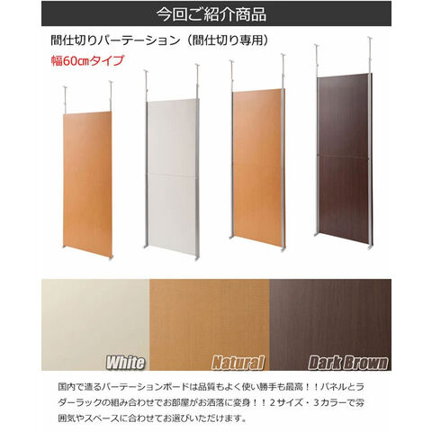 大好評の間仕切りパーテーションシリーズにシンプルな間仕切りボードタイプが登場!収納も何も必要のない間仕切りのみが必要な方や同シリーズを組み合わせてお使いいただくことでメリハリのある空間が完成します。ドアカーテンをセットすれば入り口も出来上がり。設置場所やお部屋の雰囲気にあわせてホワイト、ナチュラル、ダークブラウンの3カラーよりお選び頂けます。