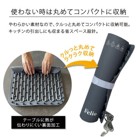 ランチョンマット感覚で手軽に使えるフードウォーマー スクエアタイプ。2段階の温度調節が可能で料理に合わせて最適な保温ができます。様々な食器に対応しており、新たに食器を買いなおす必要はありません。シリコーン素材なので割れる心配なし!お鍋やお弁当、惣菜の保温にも◎。汚れても拭き取りやすくお手入れもラクラク。使わない時は丸めてコンパクトに収納できます。ご自宅以外にパーティー・イベント・ビュッフェ等でも大活躍♪