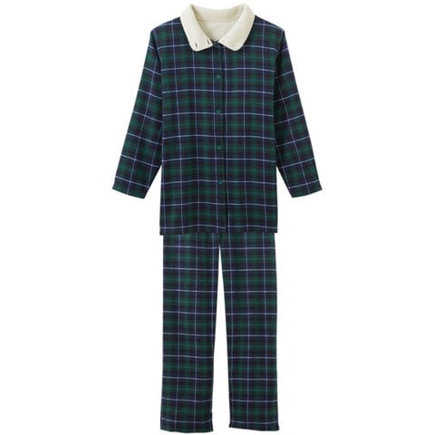 綿100%のビエラ素材を起毛させたシャツタイプのパジャマ。衿から肩にかけての肌側にはボア生地を使用し、冷えやすい肩口も暖か。就寝時には衿のボタンを閉めて寒さをシャットアウトできます。パンツの裾はお布団の中で動いてもめくれ上がらないように別布ゴム入りの仕様になっており、保温性もアップ。パンツのウエストは総ゴム仕様でゴムの長さを調節できる取替え口付きです。カラーはピンク系、グリーン系、ネイビー系の3色展開です。
