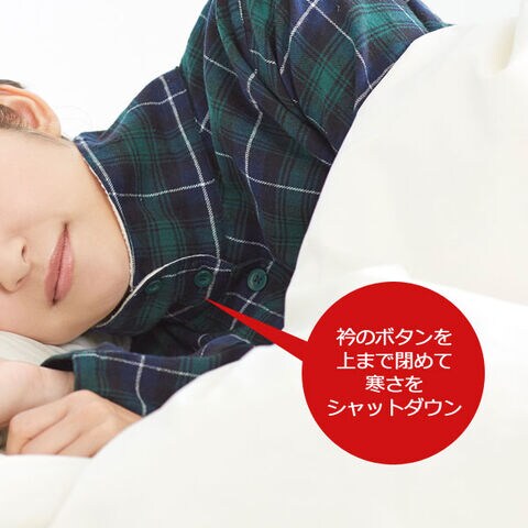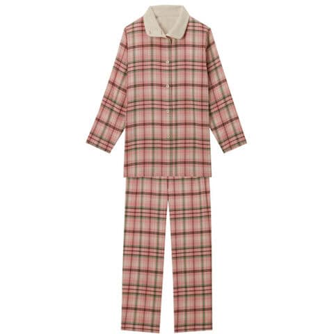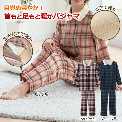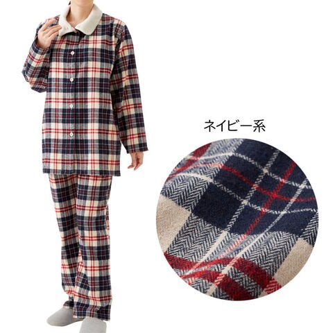 綿100%のビエラ素材を起毛させたシャツタイプのパジャマ。衿から肩にかけての肌側にはボア生地を使用し、冷えやすい肩口も暖か。就寝時には衿のボタンを閉めて寒さをシャットアウトできます。パンツの裾はお布団の中で動いてもめくれ上がらないように別布ゴム入りの仕様になっており、保温性もアップ。パンツのウエストは総ゴム仕様でゴムの長さを調節できる取替え口付きです。カラーはピンク系、グリーン系、ネイビー系の3色展開です。