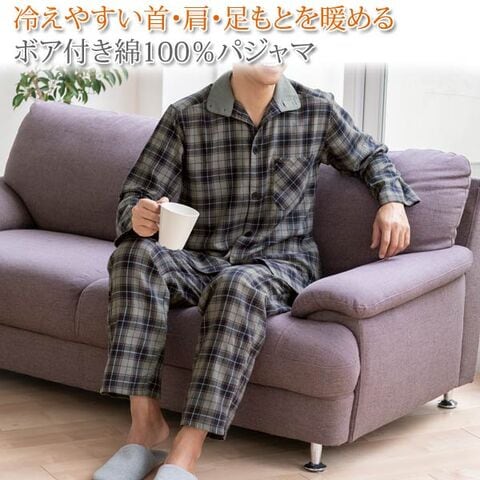 ボア付パジャマ 綿100%暖か シャツタイプ 前開きボタンタイプ 秋冬春 メンズ