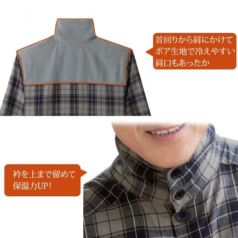 首元と肩を覆うようにボア生地が付いているので暖かさをキープ出来ます。パンツの裾の内側にもボア生地が付いていて冷えやすい足元もあったか!裾がめくれ上がらないように、パンツの裾はゴム入りの仕様になっています。身生地が綿100%なので優しい肌触りです。左胸にポケットが付いており、全開前開タイプでボタン7個付だから着脱もらくちん。パンツのウエストは総ゴム仕様で着脱がスムーズ。パンツはウエストゴム取替え口付で自分に合ったサイズ調整できます。裾に保温性を高くするゴム絞り付き別布地を特殊な縫製手法で縫い付けています。