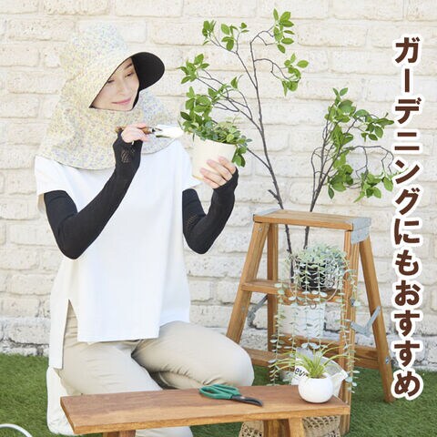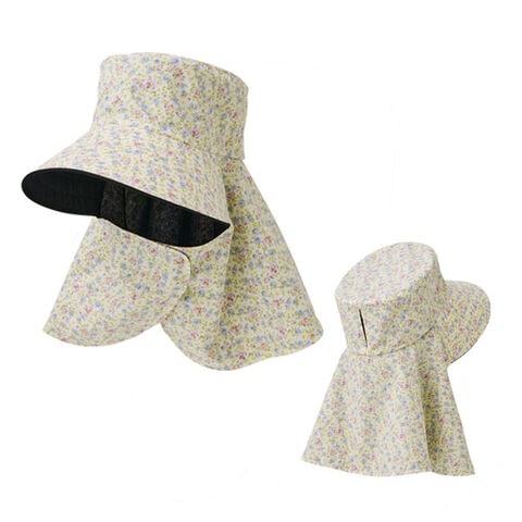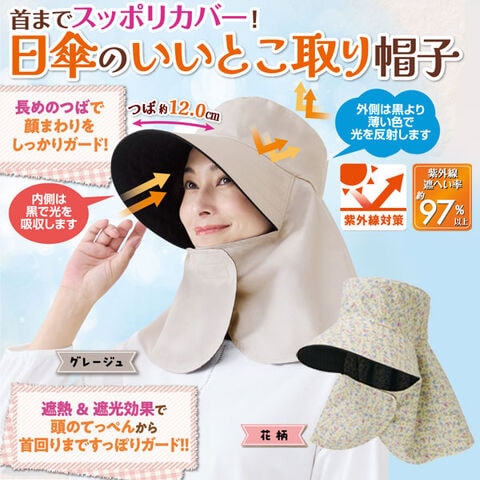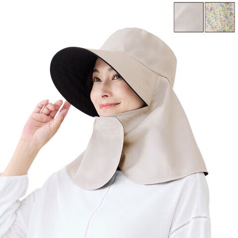 日傘は「内側が黒」「外側が淡色」または「黒より薄い色」の2色使いが効果的と言われています。外側の色で光を反射し、内側の黒で光を吸収するので暑くなりにくいと言われる日傘の原理を帽子に取り入れた仕様です。紫外線遮蔽率は約97%以上、遮光&遮熱性にも優れているので、紫外線対策と暑さ対策にオススメ!つば部分は遮光する仕様になっているので、下からの照り返しなど反射光から顔周りを守ります。フロントの面ファスナーを留めると首回りをすっぽり覆うことができます。後ろには結んだ髪束を通せるスリット付きです。カラーはグレージュと花柄の2色からお選びいただけます。
