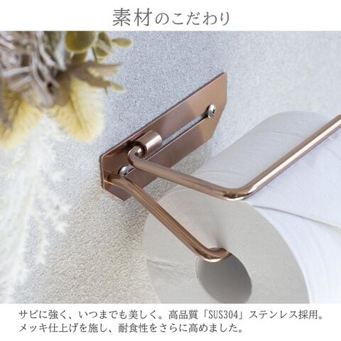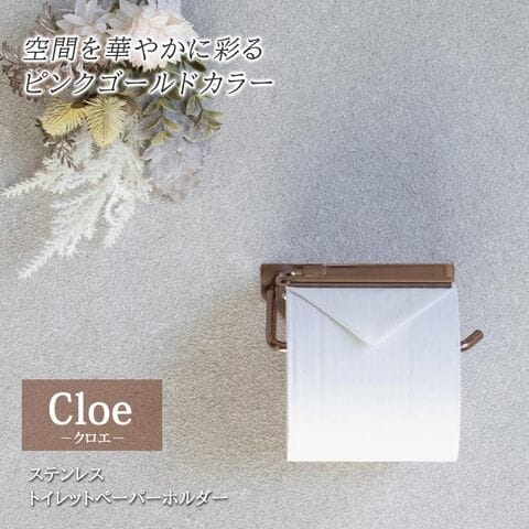 トイレ空間を華やかに彩る「Cloe(クロエ)」は、ピンクゴールドの特殊カラーが印象的なステンレス製トイレットペーパーホルダーです。飽きのこないシンプルなデザインに仕上げられており、耐食性に優れ錆びにくいSUS304ステンレスとメッキ加工により、美しい状態を長く維持できます。実用性も高く、バーの先端を曲げることでJIS規格ペーパーの脱落を防ぐほか、約10cmの幅内であれば自由な位置でネジ留めができるため、壁の下地状況に合わせた柔軟な設置が可能です。コンクリートやタイル壁用のアンカーも付属した完成品で、届いてすぐにご使用いただけます。スタンダードながら細部にまでこだわった一品です。