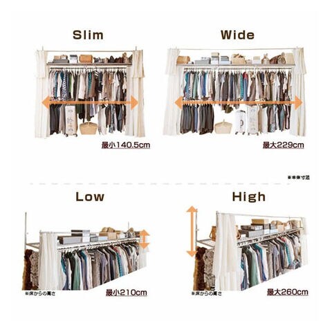 | サイズ(約) | 本体/幅140.5~229×奥行56×高さ210~260cm 地面~上棚/187.5cm 地面~ハンガーバー/上段175.5cm・下段幅60~104×高さ89.5cm |