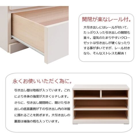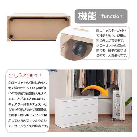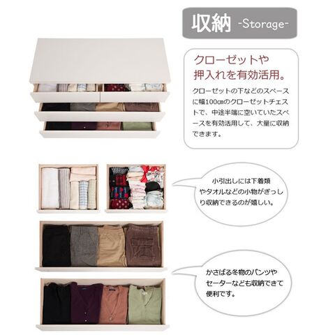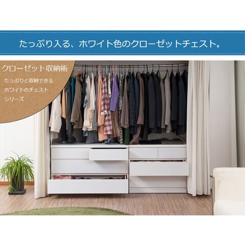 クローゼット下の中途半端に空いていたスペースを有効活用できる収納チェスト。シンプルに仕上げたホワイト色のクローゼットチェストはクローゼット内に綺麗に収納できます。隠しキャスター付きなので出し入れも楽々です。大引出しにはスライドレール付きで開閉もスムーズ。永くお使いいただく為に引出し間には地板が入っており強度も安心。使い方・収納量にあわせて、4種類からお選びいただけます。安心・安全の国産品、届いてすぐに使える完成品です。