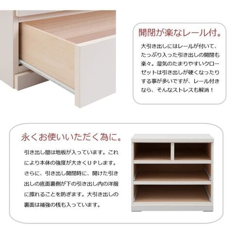 クローゼット下の中途半端に空いていたスペースを有効活用できる収納チェスト。シンプルに仕上げたホワイト色のクローゼットチェストはクローゼットだけでなく、押入れに横向きでピッタリと入いり、隠しキャスター付きなので出し入れも楽々です。大引出しにはスライドレール付きで開閉もスムーズ。永くお使いいただく為に引出し間には地板が入っており強度も安心。使い方・収納量にあわせて、4種類からお選びいただけます。安心・安全の国産品、届いてすぐに使える完成品です。