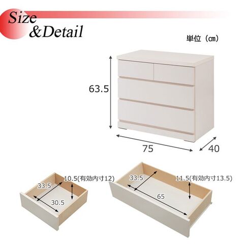 | 内寸(約) | 引出し/(小)幅30.5×奥行33.5×深さ10.5(有効内寸12)cm、(大)幅65×奥行33.5×深さ11.5(有効内寸13.5)cm |