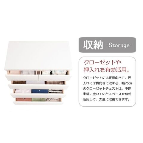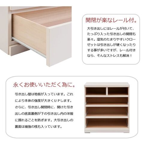 クローゼット下の中途半端に空いていたスペースを有効活用できる収納チェスト。シンプルに仕上げたホワイト色のクローゼットチェストはクローゼットだけでなく、押入れに横向きでピッタリと入いり、隠しキャスター付きなので出し入れも楽々です。大引出しにはスライドレール付きで開閉もスムーズ。永くお使いいただく為に引出し間には地板が入っており強度も安心。使い方・収納量にあわせて、4種類からお選びいただけます。安心・安全の国産品、届いてすぐに使える完成品です。