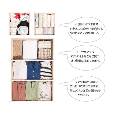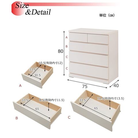 | 内寸(約) | 引出し/(小)幅30.5×奥行33.5×深さ10.5(有効内寸12)cm、(上から2段目)幅65×奥行33.5×深さ8.5(有効内寸11.5)cm、(上から3段目・4段目)幅65×奥行33.5×深さ11.5(有効内寸13.5)cm |