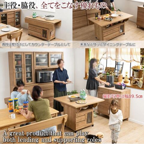 急な来訪やちょっとしたパーティーにも活躍する便利なバタフライテーブル『CORN』。テーブルとして使わない時はキッチンカウンターとして壁際に置けば、邪魔にならずに使えて大変便利です。日本製、キャスターを付けるだけの完成品でお届け。左右の天板は簡単に折りたたむことができ、用途に合わせて使い分けが可能。移動に便利なキャスターはストッパーも付いて安心。天板は水に強いオレフィンコート仕上げで、濡れたときはさっと拭けるので掃除も楽々♪テーブルの下は、全てが収納スペースになっていて食器や食品ストックなど色々収納できます。それぞれの用途に合わせて収納できる深さの違う引出しが3杯が付いており、最下段の引出しは開閉がしやすいスライドレール付きになっています。背面には調味料やボトル等、様々なものを収納する事ができます。サイドラックには雑誌やスリッパ、新聞などを収納可能。オーク柄のマットな本体×豪華なシャンパンゴールドの真鍮の取っ手が、北欧インテリアをよりお洒落に演出します。実用性とデザイン性のバランスを考えたバタフライカウンターテーブル。カウンター面の拡張ができるので、ミシン作業などワークテーブルとしても重宝します。幅89.5cmと幅119.5cmの2サイズ展開です。