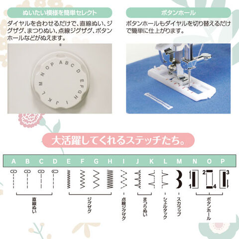 | 仕様・機能 | 自動針穴糸通し、フリーアーム、LEDランプ、縫い目長さ調節/3種固定、縫い目の幅調節/3種固定、模様数/8種類14模様、1種類4ステップボタンホール、無段階速度調節、フットコントローラー式 |