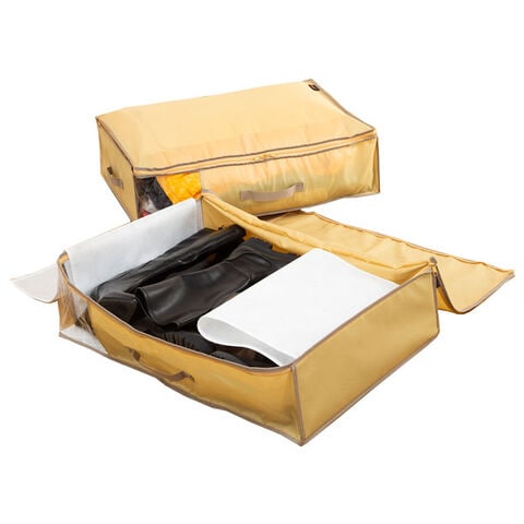 固定圧縮ベルトと側面板が付いているので、かさばらずに入れやすく、すっきりと収納できます。また前からも横からも中身がわかる透明窓付き。前と横の2か所に取っ手が付いているので、出し入れ、持ち運びにも便利。使用しない時は折りたたんでコンパクトにしまっておけます。