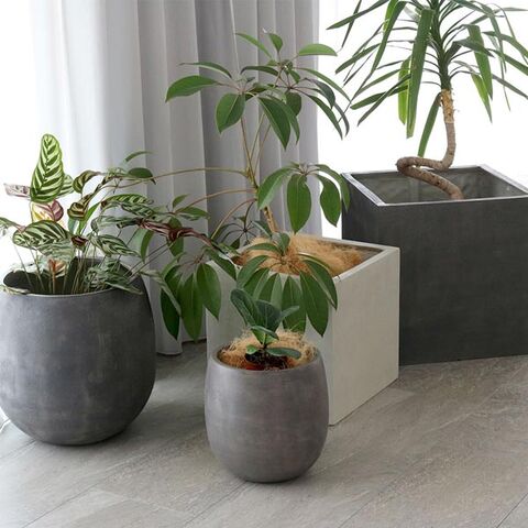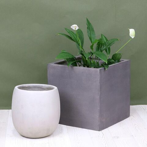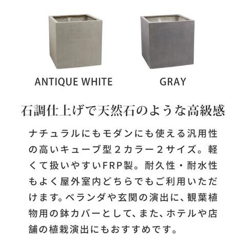 軽くて扱いやすいFRP(繊維強化プラスチック)製のプランター。ナチュラルにもモダンにも使える汎用性の高いキューブ型。耐久性・耐水性もよく屋外室内どちらでもご利用いただけます。ベランダや玄関の演出に、観葉植物用の鉢カバーとして、またホテルや店舗の植栽演出にもおすすめです。軽量で丈夫な樹脂製なので、花壇のレイアウト変更も楽にできて、高層階や屋上への持ち運びも簡単です。腐食にも強いため、庭や店舗の外にも最適。屋外の使用でも劣化が比較的少なく、草花や球根の寄せ植えはもちろん、家庭菜園など様々な栽培に適しています。幅は40cmと50cmの2サイズ展開、カラーはグレーとアンティークホワイトの2色からお選びいただけます。