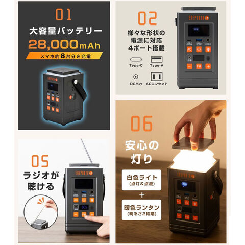 簡単操作のあんしん安全ポータブル電源「ENEPORTA+3」は、災害時にも役立つ多機能・コンパクトな電源です。発火等の事故の危険性が極めて低いリン酸鉄リチウムイオンバッテリーを採用し、大容量28,000mAhながら約1.2kgの超軽量を実現。電源(AC/DC/USB)、照明(白色ライト/暖色ランタン)、情報収集(ワイドFMラジオ)の「三大ライフライン」をこれ一台でカバーします。普段使いはもちろん、防災用品を揃え始めた方や、アウトドア・旅行時のサブバッテリーとしても最適です。操作もシンプルで、いざという時も安心です。
