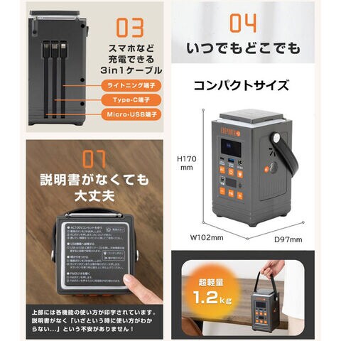 大容量バッテリー/様々な形状の電源に対応4ポート搭載/ラジオが聴ける/安心の灯り スマホなど充電できる3in1ケーブル/コンパクトサイズ/説明書がなくても大丈夫