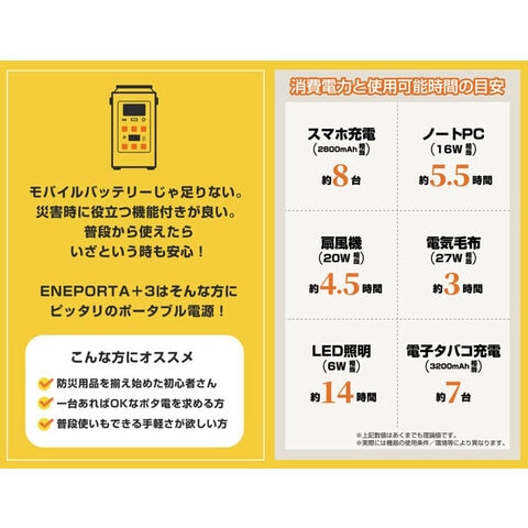 こんな方にオススメ/消費電力と使用可能時間の目安 防災士推奨商品 ここがポイント/アウトドアやキャンプ/出張や旅行時のサブバッテリー/車内で電源が欲しい時に