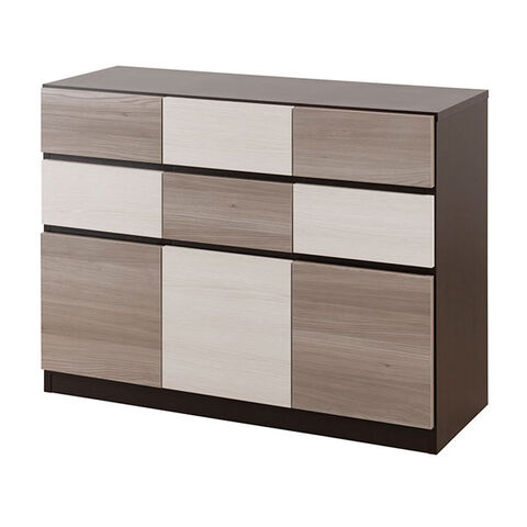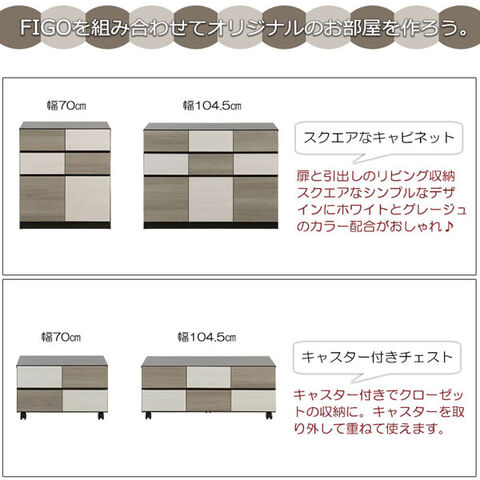 日本国内で造られた品質の高い完成品のキャビネットチェスト【Figo】フィーゴシリーズ。人気カラー3種ホワイトウォッシュ・グレージュ・ダークブラウンを使って、モダンな外観で洋室や和室にも合わせやすいお洒落なデザインに仕上げました。交互に配置された市松模様の前面がお洒落。使い勝手のよい扉と引出しの組合せで仕分けと収納力の良さがウリ。取っ手のないスッキリとした仕上げで、引出しは下に指がかかるように掘り込みを施し、更にスライドレール付きで開閉楽々。引出しには細々した物を収納し、扉内にはA4サイズの書類が収納できるので、書類が綺麗に整頓ができ、収納スペースを無駄にしません。用途に合わせて収納方法を使い分けられて便利です。スタイリッシュなデザインでどんな空間にも合います。使い勝手が良いので、整理整頓が楽になります♪ロータイプのチェストを重ねてスタッキングで、収納量アップできるのも魅力です。