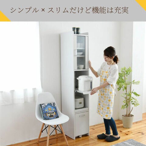 幅32.5cmの隙間を、床から天井まで活用する高さ181cmのハイタイプ。上部の「オープン棚」にはストック品を、その下の「擦りガラス扉」には食器をたっぷり収納。扉は組立時に左右開きが選べ、可動棚3枚で効率的に収納できます。中段には炊飯器とポットなど家電を2台置けるスライド棚を2段装備。背は熱を逃すパンチング加工付きで安心です。最下段は食品ストックの収納に便利な「引き出し」付き。重くても開けやすい専用キャスターが付いており、食品ストックの収納に便利です。