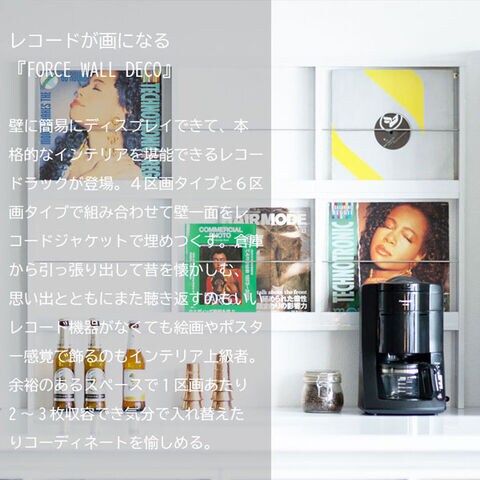 人気急上昇中の「FORCE」から壁にディスプレイができるレコードラックが新登場!「FORCE」は木目のない無地の白にハイグロスコートで光沢感と高級感を備えたハイクラスシリーズ。レコードのみならずお気に入りの雑誌やフライヤー、ポスターなど何でもディスプレイして他と差をつけカッコいい空間にアレンジ可能。超薄型なのでカウンター下のような省スペースや、カウンター上にミュージックバーのような雰囲気のディスプレイも。4区画と6区画の2タイプ展開で、スタッキングしたり並べたり、大迫力なシーンにできるなど使い方無限大。白は部屋に圧迫感を感じず置けて、ハイグロスの反射で部屋を広く見せる効果も。