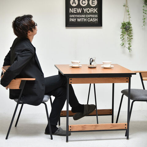 マットなパウダー塗装のブラックフレームに、シャープなメラミン天板。細くクールなアイアンフレームを補うのは木肌感を強く残した赤みのあるレッドオークの貫。色味、質感、手触り、どれもが革新的で刺激的な組み合わせのダイニングテーブル。75cmの正方形タイプで1~2人にぴったりのコンパクトタイプ。ボルトはマットなブラック、アジャスターには金色のメタルパーツを採用。小さなパーツにも手を抜かない、大人のこだわりのつまったシリーズです。