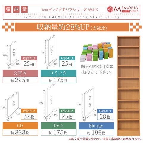 | 仕様 | ・収納量/[文庫]約225冊・[コミック]約175冊・[CD]約333枚・[DVD]約175枚・[Blu-ray]約196枚 ・可動棚/8枚 ・設置する際には、本体が転倒しないよう、I字プレートで必ず壁と固定してください。 ・組立時間の目安/大人2人で約30分 |
