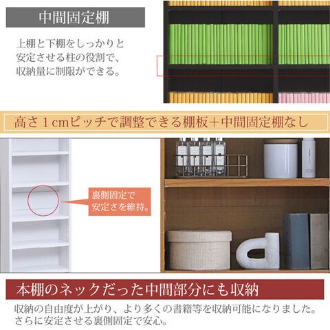 1cm間隔で棚板が設置でき、固定棚の無い画期的な仕様により、従来よりも自在な棚割りを可能にしました。ラックの中にデッドスペースを作らず、より多くの物が収納できます。薄型だからリビングだけでなく廊下や、狭いスぺースでも収納を確保できます。シリーズで揃えればまるで図書館 。スリムなサイズの薄型幅41.5はリビングにも、プライベートルームにも。
