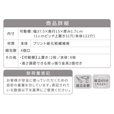 | 内寸(約) | 【本体】 オープン部/幅34.0×奥行14.5×高さ167.0cm 可動棚/幅37.5×奥行15.0×厚み1.7cm(1cmピッチ上下各61穴) 幅木避け/奥行2.4×高さ8.0cm 【上置き】 オープン部/幅34.0×奥行13.5×高さ51.5cm 可動棚/幅37.5×奥行15×厚み1.7cm(1cmピッチ31穴) |