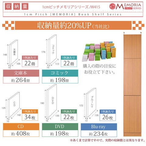 | 仕様 | ・収納量/[文庫]約264冊・[コミック]約198冊・[CD]約408枚・[DVD]約198枚・[Blu-ray]約234枚 ・可動棚/本体8枚 、上置き2枚 ・組立時間の目安/大人2人で約65分 |