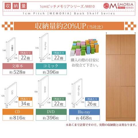 | 仕様 | ・収納量/[文庫]約528冊・[コミック]約396冊・[CD]約816枚・[DVD]約396枚・[Blu-ray]約468枚 ・可動棚/本体16枚 、上置き4枚 ・組立時間の目安/大人2人で約105分 |