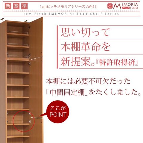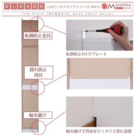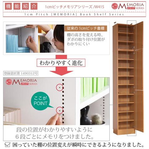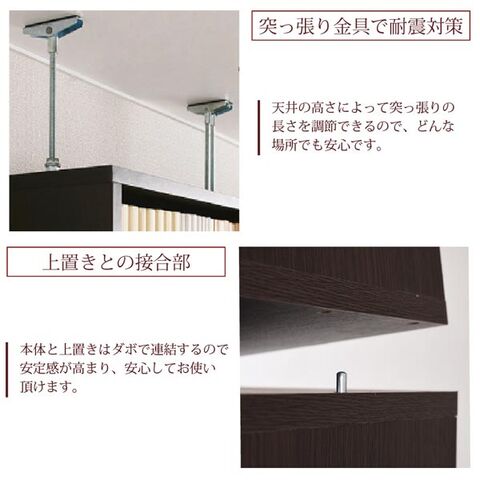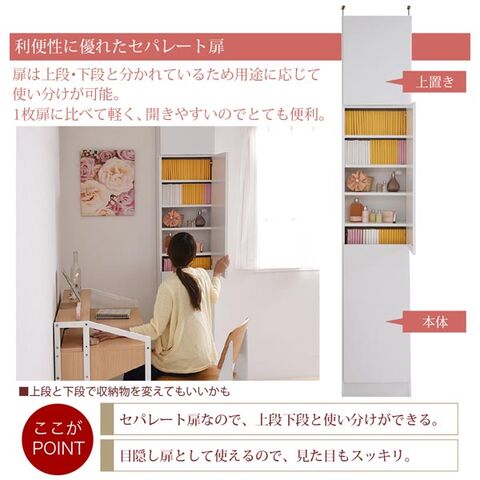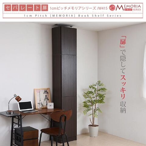 突っ張り上置きセットなので天井まで空間の無駄を省いて大量収納。1cm間隔で棚板が設置でき、固定棚の無い画期的な仕様により、従来よりも自在な棚割りを可能にしました。ラックの中にデッドスペースを作らず、より多くの物が収納できます。深型だから、文庫本や大きな辞書はもちろん、本だけでなく雑貨まで収納。扉付だから、見せたくないものの収納にも。スリムなサイズの深型幅41.5cmはリビングにも、プライベートルームにも。
