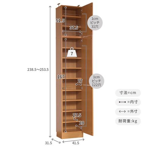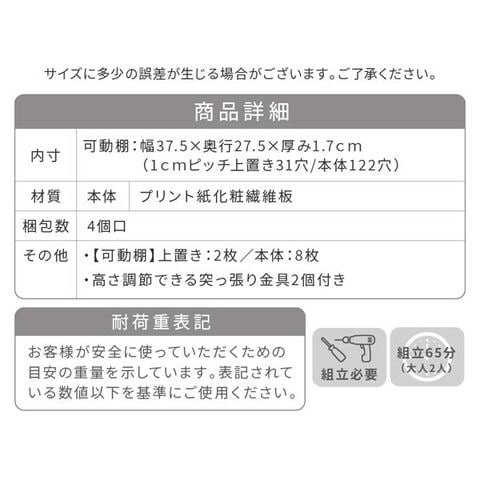 | 内寸(約) | 【本体】 オープン部/幅34.0×奥行27×高さ167.0cm 可動棚/幅37.5×奥行27.5×厚み1.7cm(1cmピッチ上下各61穴) 幅木避け/奥行2.4×高さ8.0cm 【上置き】 オープン部/幅34.0×奥行26×高さ51.5cm 可動棚/幅37.5×奥行27.5×厚み1.7cm(1cmピッチ31穴) |