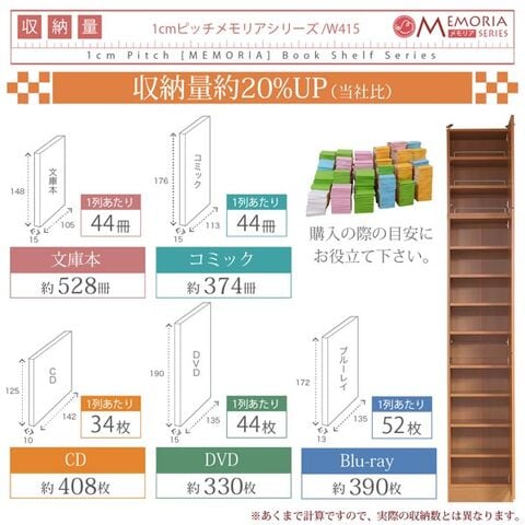 | 仕様 | ・収納量/[文庫]約528冊・[コミック]約374冊・[CD]約408枚・[DVD]約330枚・[Blu-ray]約390枚 ・可動棚/本体8枚・上置き2枚 ・組立時間の目安/大人2人で約65分 |