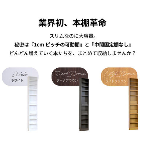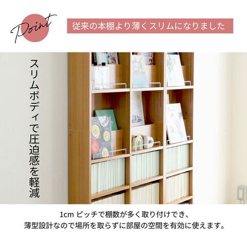 床から天井まで(高さ約238~253cm)の空間を無駄なく使える突っ張り式スリム本棚。本体に飾り棚2枚と可動棚3枚、上置きに可動棚2枚の計7枚の棚をご用意。全ての棚は1cmピッチで高さ調節でき、増え続ける本も効率よく収納可能です。更に中間固定棚がないため、趣味の道具などの多目的な収納庫としても活躍。天井でしっかり固定するため、万が一の地震にも安心な大容量の壁面収納が実現します。