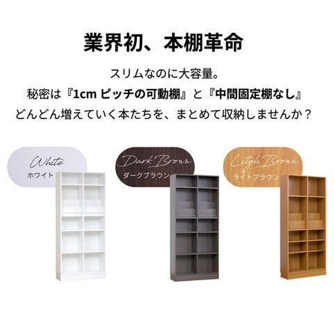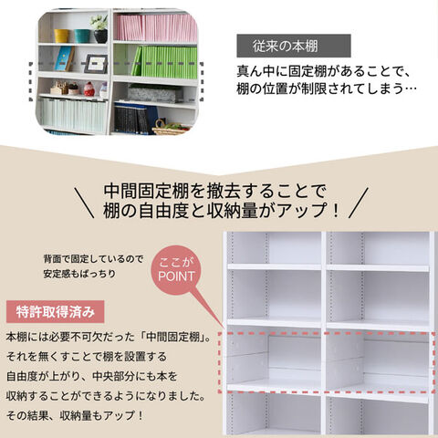 幅81cm・奥行29.5cmで豊富な収納力を誇る、大容量の深型オープン本棚。お気に入りを飾れる「飾り棚」2枚と通常の可動棚6枚の計8枚の棚を装備。全ての棚は1cmピッチで高さ調節でき、A4ファイルから専門誌まで幅広く対応。深さを活かせばコミック等の前後2列収納も可能で、壁一面が頼れる書庫になります。