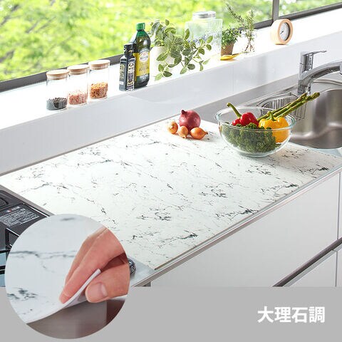 キズや汚れが気になるキッチンの調理台を保護するシリコンマット。毎日使うキッチンだから、調理する調理台はキレイに便利に使いたい、長年使い続けてキズや汚れが目立つキッチンをキレイにしたい、リフォームもお金がかかるし、かといってこのまま汚れが目立つキッチンで調理するのも気分が乗らない・・・。そんな方にオススメ!カラーは大理石調と白無地の2色からお選びいただけます。マット自体は耐熱性にも優れているので、一時的に熱いやかんやお鍋をおいても大丈夫。まな板を置いてもズレにくく、硬いものを切ったり、大根をおろしたりなど力が必要な作業でも安心です。サイズは選べる3サイズ。ご自宅の調理台サイズに合わせて自由にカットできるのもうれしいポイント。裏側は凹凸のない滑り止め加工で、カビの原因となる水や異物が裏面に侵入しにくい仕様です。